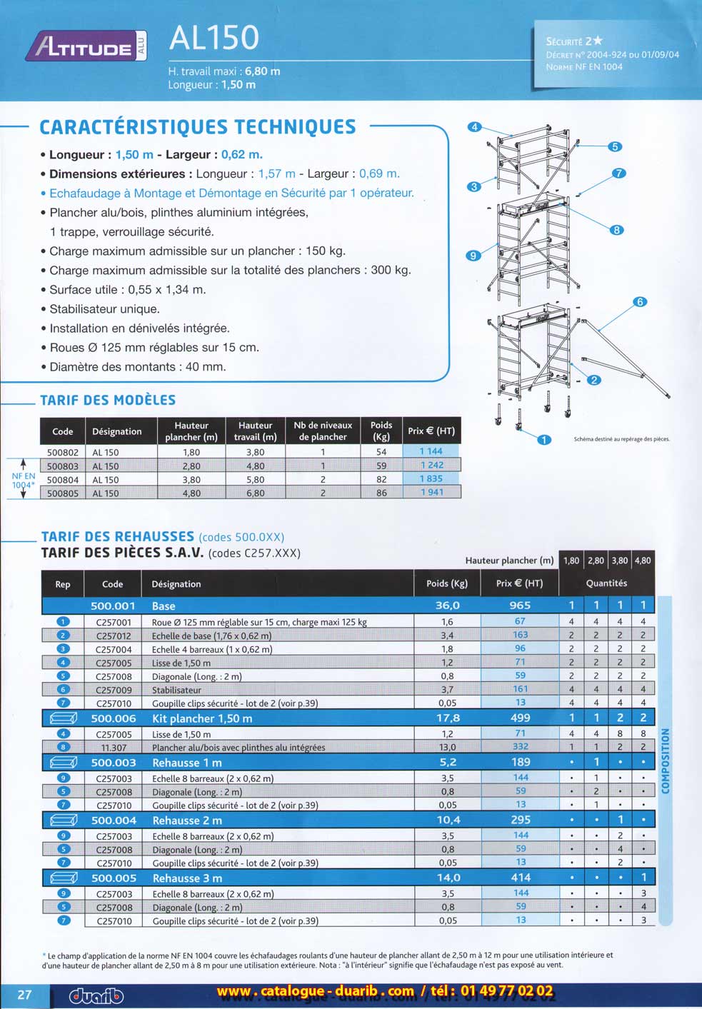 Echafaudages en alu , Gamme DUARIB aluminium ALTITUDE 150, 200 et 250, Norme NF EN 1004, décret n° 2004-924 du 01/09/04 . |