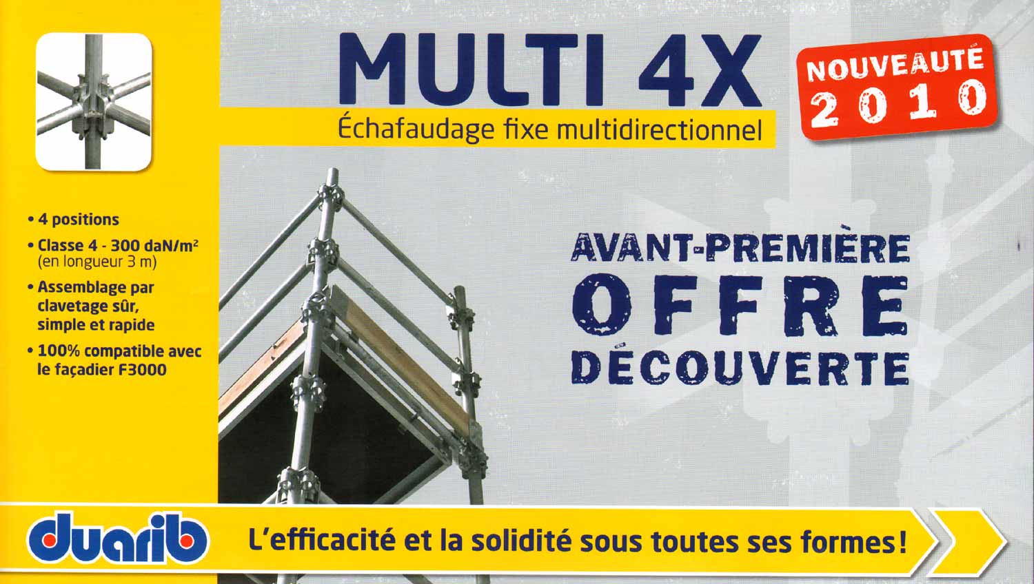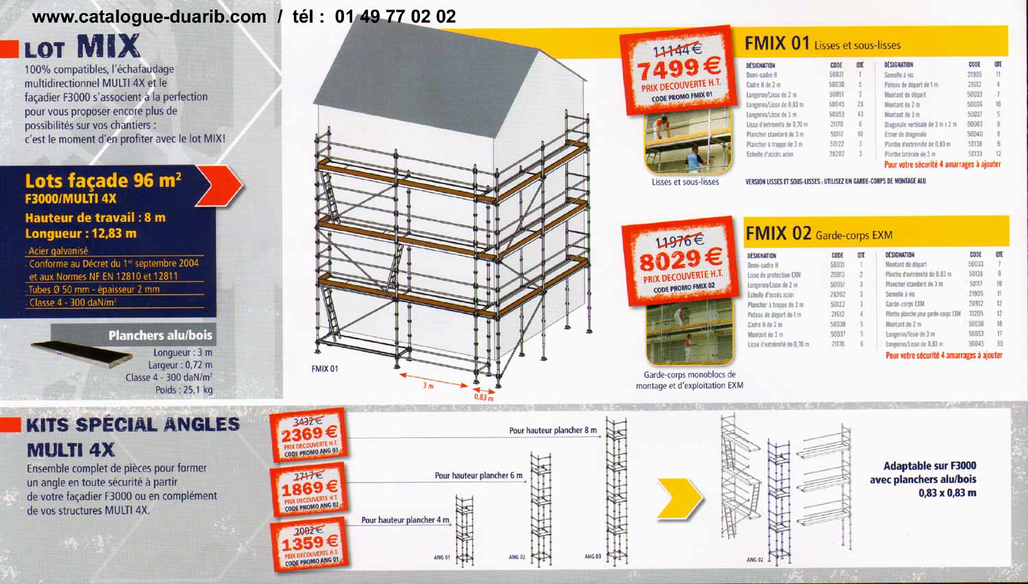 echafaudage fixe, échafaudage sur facade, echafaudage pour macon, echafaudage pour maçons, duarib vous propose des promotions valables jusqu'au 12/09/2008 Des prix, encore des prix pour des lots d' échafaudages de façade R200, des lots d'échafaudages de constructions M49, de couvreur, des lots de planchers aluminium, acier, des lots de filets, d'amarrages chevilles ou vérins.Sans oublier, les échafaudages roulants en aluminium hauteur plateau 6 / travail 8 m, pour le 180, 280, 400, 600, avec escaliers intérieurs. L' échafaudage roulant anodisé, à ne pas rater pour travailler sans avoir les mains sales. Les plates-formes de sécurité sont aussi en promotion, le tétris, le minix, l' hélis, le marchepieds sécurisé aluminium skippy 3 ou 4 marches