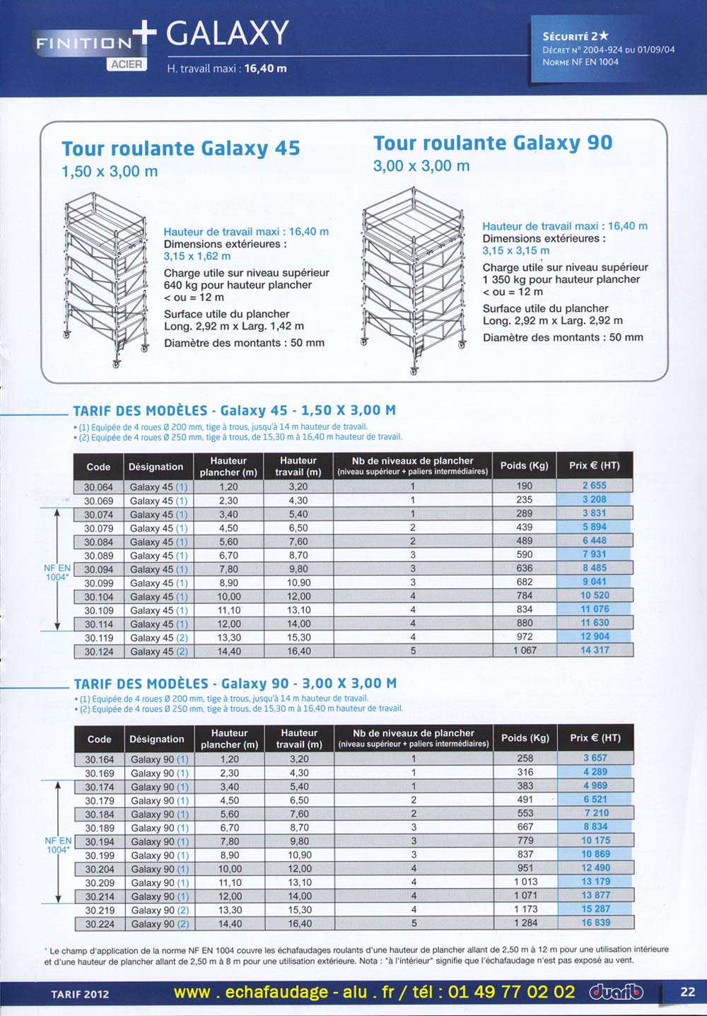 page n° 21 et 22 du catalogue DUARIB , Galaxy . d' échafaudages roulants aluminium et acier