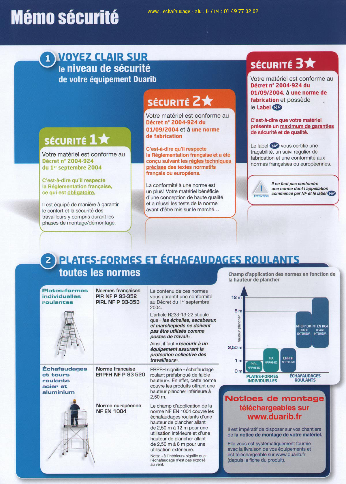 page n° 53 du catalogue DUARIB , tableau des sécurités . d' échafaudages roulants aluminium et acier