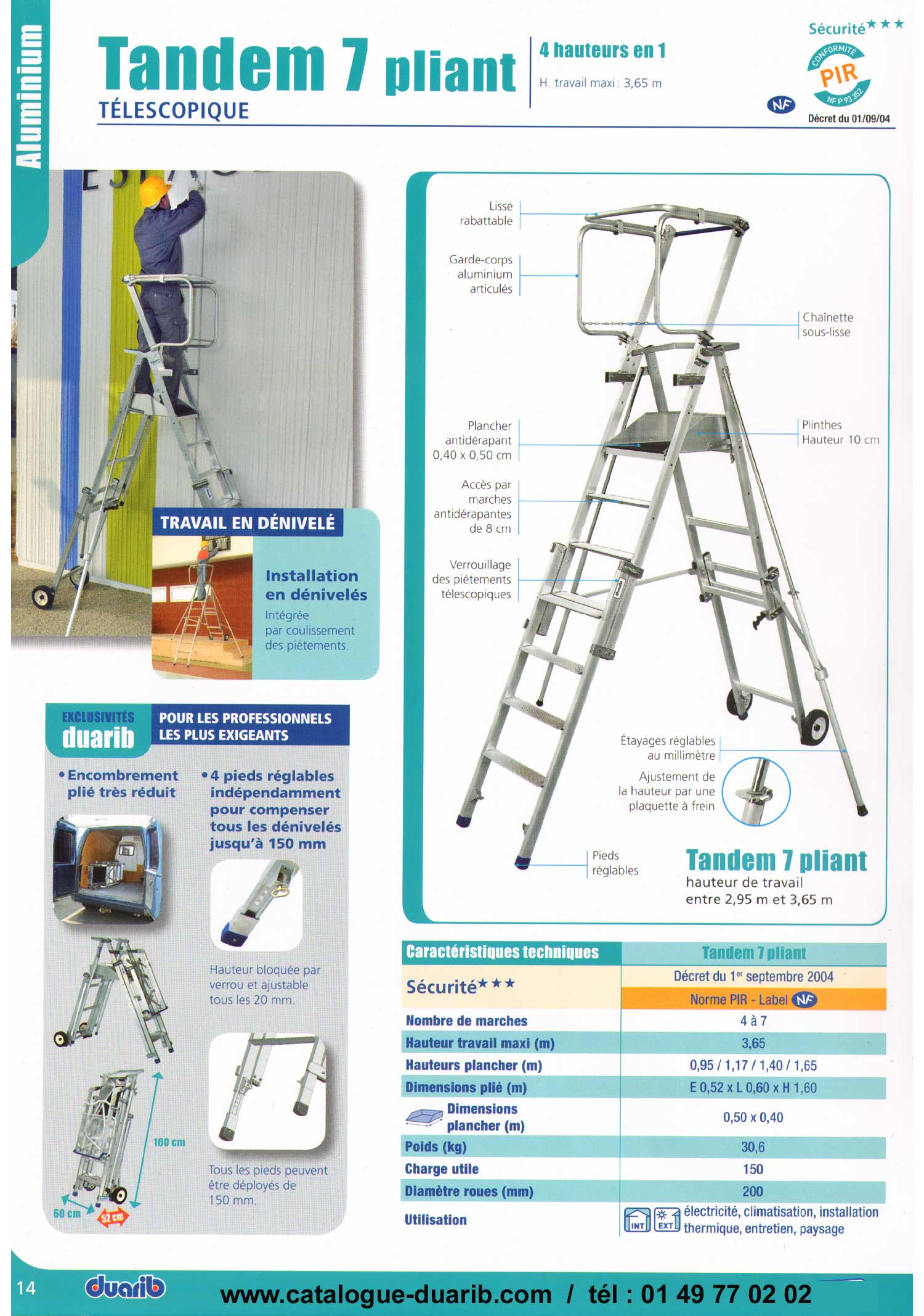 les échafaudages aluminium, échafaudage aluminium Comabi duarib , prix des échafaudages aluminium comabi duarib sont visibles dans le catalogue duarib ainsi que les prix des échafaudages aluminium mais aussi les prix des échafaudages acier pour façade donc pour façadier, pour peintre, pour maçon, pour couvreur, dans toutes les hauteurs. Les échafaudages fixes R200 sont aux nouvelles normes européennes EN12810 et 12811 conforme au décrêt 01/09/2004. Nous vous proposons des échafaudages aluminium starlium idéal pour un travail en façade ou sous plafond, les géréris en acier, hauteur plateau 6 mètre, -6 m, 7 mètres, 7 m, 8 m, 8 mètres, 9 m, 9 mètres, 10 m, 10 mètres, 11 m, 11 metres, 12 métres, 12 m, 13 m, 13 métres, 14 m, 14 mètres, 15 m, 15 mètres, 16 m, 16 mètres, 17 m, 17 mètres, 18 m, 18 mètres. Vous trouverez également des gazelles ou tétris, socles à vis articulé pour départ d'échafaudage, filets de protection, des colliers orientables, amarrges chevilles, amarrage vérins, plancher alu, plancher alu-bois, placher acier. La tour escalier 3 m x 1.50 mètres de large de type solidium, des monte-matérieux pour couvreur, plaquiste, pour maçon à des prix très intéressants.